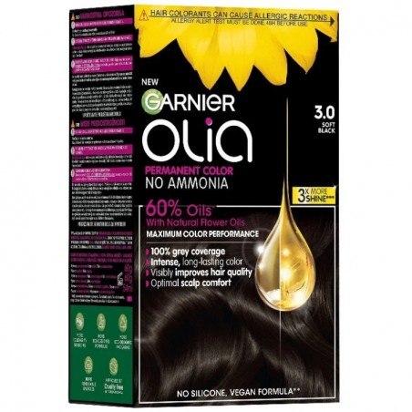 Descopera Vopseaua Garnier Olia 3.0 Negru Soft. Formula cu 60% uleiuri, fara amoniac, ofera o culoare bogata, intensa si acopera 100% firele albe. Cumpara acum!