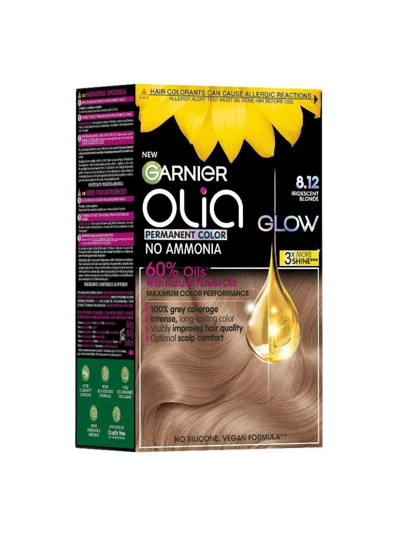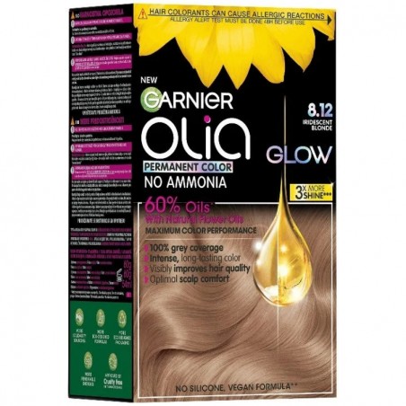 Garnier Olia - obtine o nuanta moderna si sofisticata de blond irizat cu vopseaua permanenta Garnier Olia 8.12 Iridescent Blonde. Aceasta formula inovatoare, imbogatita cu 60% uleiuri din flori, asigura un rezultat elegant, cu subtonuri delicate, totul fara a folosi amoniac. Olia transforma procesul de vopsire intr-o experienta placuta si delicata, lasand parul vizibil mai sanatos si incredibil de moale.